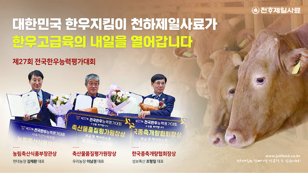 천하제일사료(대표이사 권천년)의 고객농장들이 ‘제27회 한우능력평가대회’에서 농림축산식품부 장관상 등 총 3개를 수상하며 우수한 성과를 기록했다고 밝혔다.