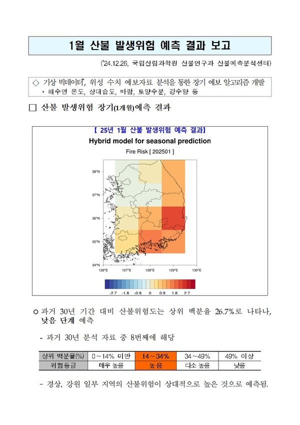 안희영 산림과학원 산림재난예측·분석센터장은 “이번 주말 중부지역을 중심으로 눈·비 예보가 있으나 동해안 지역은 비 예보가 없어 산불위험이 높을 것으로 판단된다”며 “작은 불씨도 대형산불로 번질 수 있으니 산림 가까운 곳에서 쓰레기나 농업 부산물을 태우는 것을 자제해야 한다”고 강조했다.