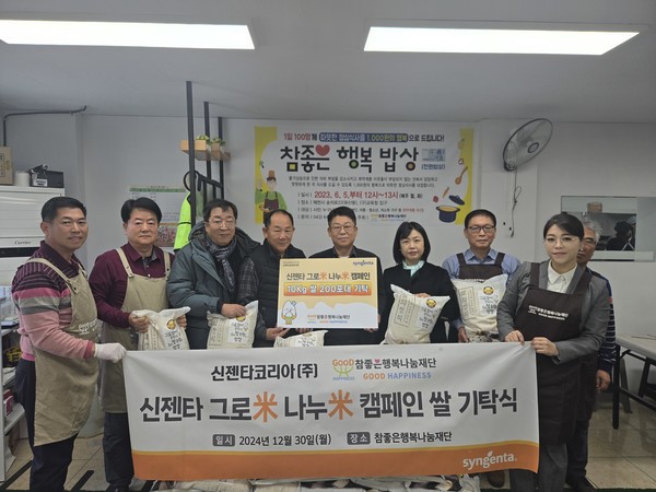 신젠타코리아는 지난해 12월 30일 충북 제천시에 위치한 참좋은행복나눔재단에서 ‘그로미 나누미’ 캠페인을 진행했다. 행사에는 신젠타코리아의 백승보 영업본부장, 임화정 인사본부장이 참석했으며 재단의 유영화 이사장, 이상천 이사 등 다수의 관계자가 함께했다.