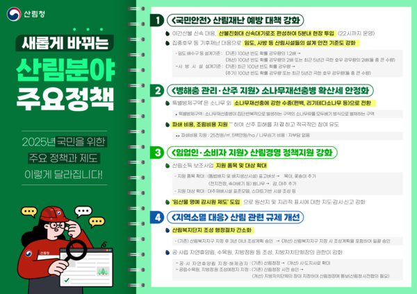 올해부터 산불, 산사태, 소나무재선충병 등 산림재난 대응방법이 개선된다. 또 산림보조사업 지원대상도 확대돼 보다 많은 임업인들이 지원받을 수 있을 것으로 기대된다.