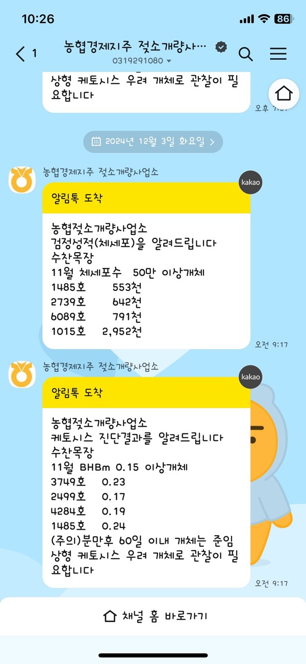 이번에 확대된 카카오 알림 서비스 항목에는 체세포가 높아 조기 도태가 필요한 개체 파악에 도움을 주는 지표인 감별체세포를 추가하고 에너지가 불균형한 개체 파악을 돕는 케토시스 분석도 확대돼 낙농가들에게 도움이 될 전망이다.