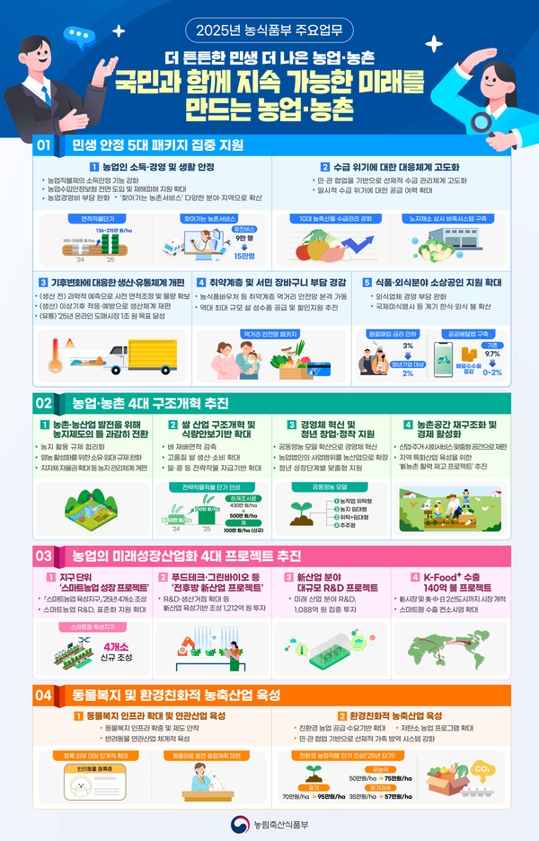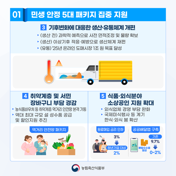 농식품 분야 5대 민생 안정 패키지 중심으로 상반기에 집중 지원한다. 이와 관련 농업인 소득안전망 확충과 농촌 생활 안정 지원 강화와 함께 농축산물 수급 관리, 서민 먹거리 부담 완화에 총력 경주하기로 했다.