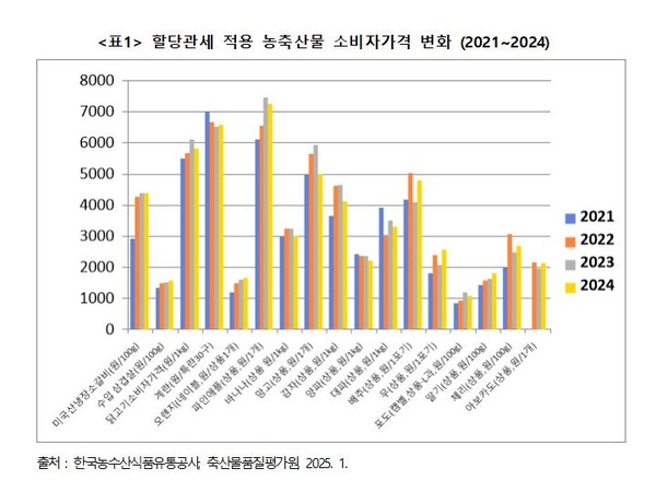또한 2022년부터 지난해까지 1년 이상 할당관세를 적용한 17개 품목의 수입가격 인하율대비 소비자가격 변동율을 비교 분석한 결과에서는 농축산물 소비자가격은 강보합세를 나타냈다. 실제로 미국산 냉장 소갈비는 2022년 7월 할당관세를 적용해 수입가격을 23% 낮췄지만 소비자가격은 2021년보다 45% 상승했으며 2023년과 지난해에도 가격이 올랐다. 삼겹살 역시 2022년과 2023년 할당관세 적용으로 수입가격 인하 효과가 18~20%였지만 소비자가격은 각각 12%와 2% 더 높아졌다. 닭고기 역시 할당관세로 수입가격은 2022년부터 해마다 17~22% 하락했지만 실제 소비자가격은 3년간 6% 올랐다. 이외에도 무, 배추, 딸기, 체리, 아보카도, 오렌지, 파인애플, 바나나, 망고가 할당관세로 수입가격이 인하됐지만 소비자가격은 오히려 상승했다.