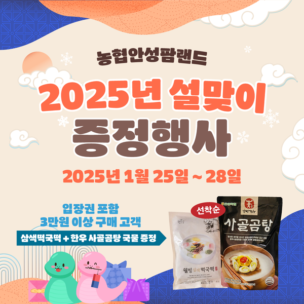 이 기간 동안 입장권을 포함해 당일 3만 원 이상 구매한 고객들은 간편하게 즐길 수 있는 삼색 떡국 떡(600g)과 진공 파우치로 포장된 한우 사골곰탕(600ml)을 받을 수 있다. 증정품 수령 장소는 안성팜랜드 입구에 위치한 팜 편의점이다.