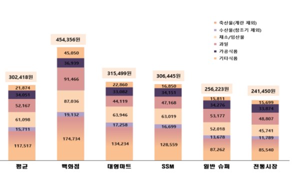 부류별로 살펴보면 지난해에 비해 축산물은 12.1%, 수산물은 12.8%, 채소·임산물은 2.1%, 기타식품은 0.2% 가격이 상승했으며 과일은 6.4%, 가공식품은 1.8% 하락했다.