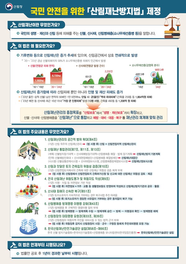 법 내용을 살펴보면 우선 산림재난 관리 범위를 산림뿐 아니라 산림과 인접한 지역까지 확대하며 연접 토지에서 건축 등을 진행할 경우 산림재난 위험성 사전 검토를 실시해 국민 안전과 재산보호를 강화한다.
