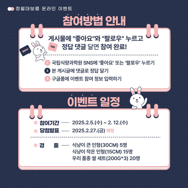 정월대보름 온라인 행사에 대한 자세한 안내는 국립식량과학원 누리집(www.nics.go.kr)과 기관 사회관계망(SNS)에서 확인할 수 있다.