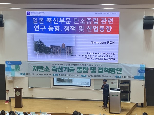 노상건 일본 도후쿠대학 교수는 지난 14일 건국대학교 산학협동관 223호에서 한일연구자교류협회와 일본학술진흥회가 공동주최하고 한국축산경영학회가 주관한 ‘저탄소 축산기술 동향 및 정책방안’ 주제의 2025년 동계 한·일 공동 심포지엄에서 이같이 밝혔다.