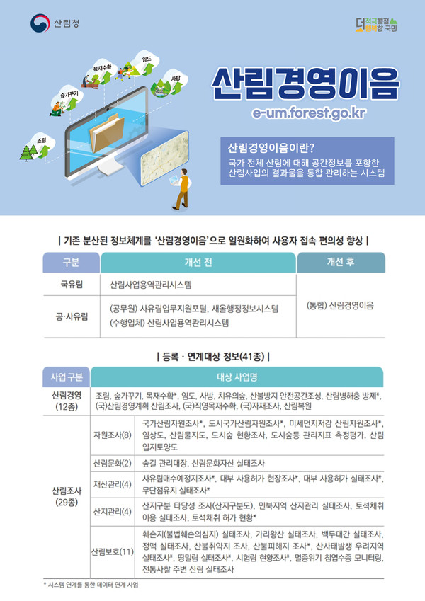 산림경영이음 시스템은 조림, 숲가꾸기, 목재수확, 임도, 사방 등 산림경영 정보 12종과 도시숲 현황, 숲길 관리 등 산림조사 29종에 대한 정보를 관리할 수 있으며 산림경영활동 정보도 조회할 수 있다.