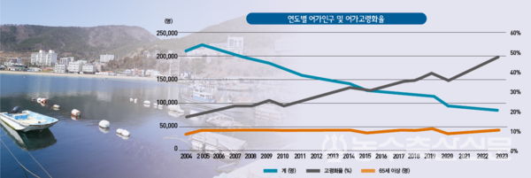 어촌은 고령화와 인구감소로 소멸위기에 직면해 있다. 통계청 국가통계포털에 따르면 어가인구는 2004년 20만9855명에서 2023년 8만7115명으로 줄어 20년 사이에 58.5%가 줄었다. 어가인구의 빠른 감소속에 고령화율 역시 매우 빠른 속도로 높아지고 있다. 2004년 17.05%였던 고령어가의 비율은 2023년 47.96%를 기록해 20년간 고령화율이 30.91% 포인트 높아졌다. 즉 어촌사회의 2명중 1명꼴로 65세 이상의 고령층이라는 의미다.