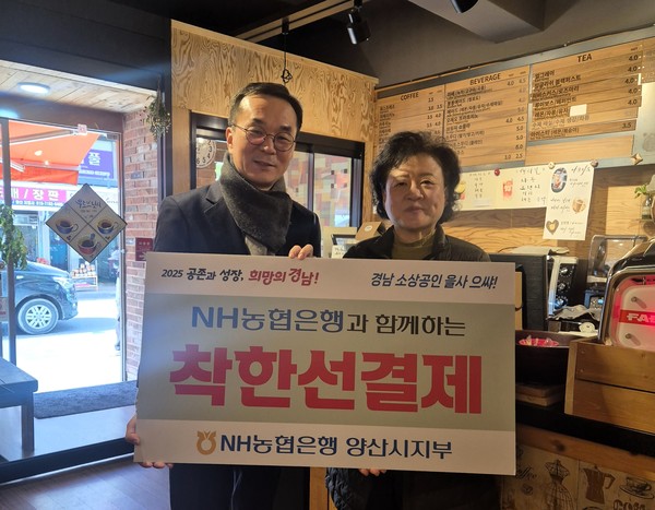 농협양산시지부(지부장 주세연, 사진·왼쪽)는 지난달 25일 양산지역 골목상권에서 소상공인 사기진작과 지역경제 활성화 지원을 위한 ‘착한선결제 캠페인’을 펼쳤다.
