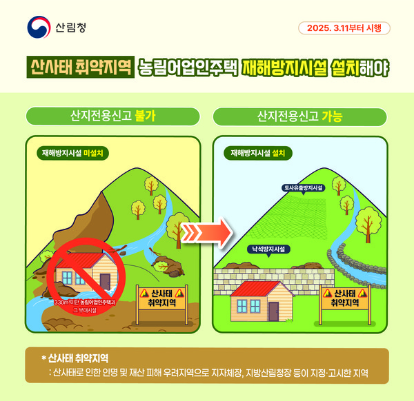 이번 산지관리법 시행령 개정으로 농림어업인 주택시설 부지는 산사태취약지역이 포함될 수 없도록 규정됐다. 다만 현장 여건상 부득이하게 편입이 필요한 경우에는 △토사유출방지시설 △낙석방지시설 △옹벽 △사방댐 △침사지 △배수시설과 같은 재해방지시설을 설치하는 조건충족 시 가능하도록 해 폭우 등으로부터 재해 발생 우려를 줄일 수 있도록 했다.