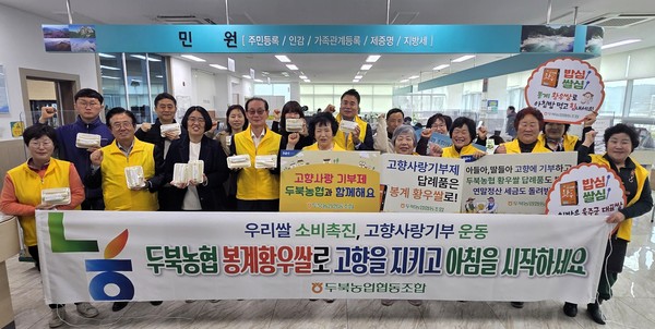 이날 행사에는 두북농협 임직원과 여성대학봉사단, 두서면·두동면사무소 직원 40여 명이 함께했다. 참석자들은 봉계황우쌀로 만든 떡을 배부하며 지역 쌀 소비를 위한 홍보와 고향사랑기부제 기념품으로 봉계황우쌀 애용을 권장하는 뜻깊은 시간을 가졌다.