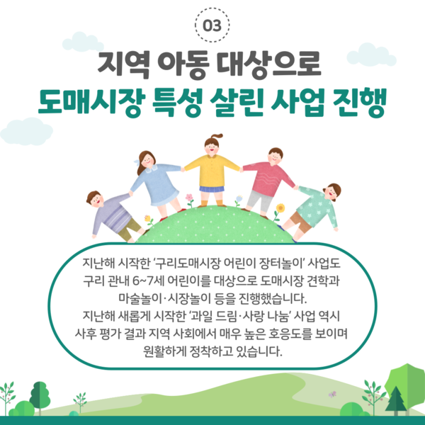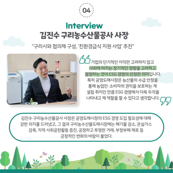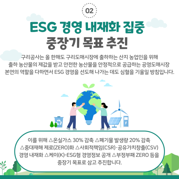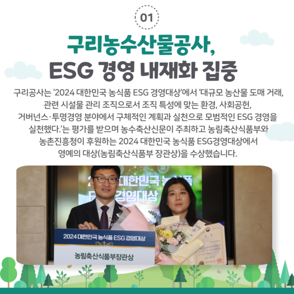 구리공사는 ‘2024 대한민국 농식품 ESG 경영대상’에서 ‘대규모 농산물 도매 거래, 관련 시설물 관리 조직으로서 조직 특성에 맞는 환경, 사회공헌, 거버넌스·투명경영 분야에서 구체적인 계획과 실천으로 모범적인 ESG 경영을 실천했다.’는 평가를 받았습니다.