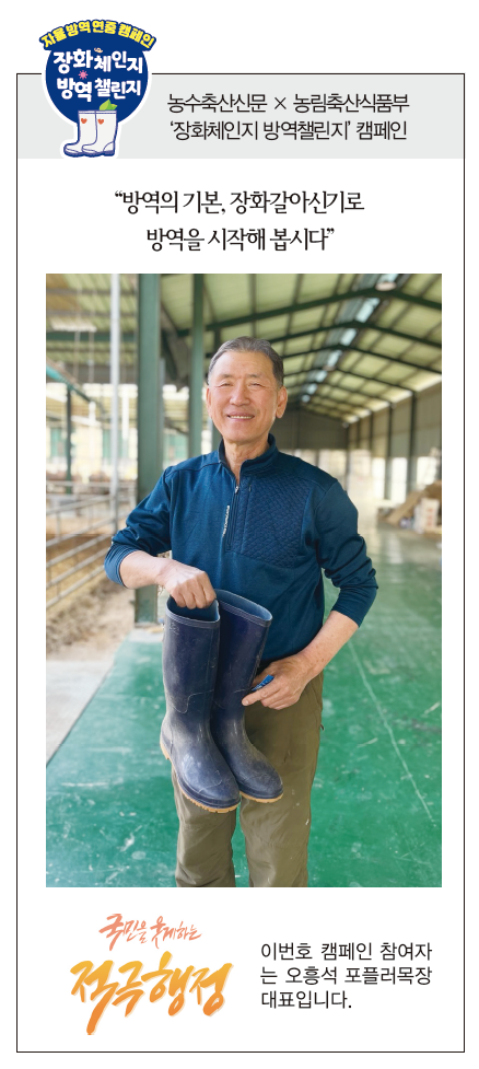 [농수축산신문=농수축산신문] 이번호 캠페인 참여자는 오흥석 포플러목장 대표입니다. 농수축산신문 webmaster@aflnews.co.kr 다른기사 보기 저작권자 © 농수축산신문 무단전재, 재배포 및 AI학습 이용 금지 당신만 안 본 뉴스 [AFL칼럼] ASF 백신 개발, ‘K-방역’의 새 지평 열까 서울 영등포농협 사회공헌실천재단, '가정의 달 이벤트' 경품 증정식 개최 예산군, ‘힐링·건강·나눔’으로 주민 삶의 질 높인다 영등포농협 사회공헌실천재단, 동작구 '사랑의 온도탑' 제막식 '1호 주자'로 나서 지역사회 온기 확산 물꼬 터 차기 농협 축산경제 대표이사 선거 3파전 영농형태양광, 임차농 보호장치 마련을…정부, 투기 방지법 ‘밑그림’ [Issue+] 2026 국제곡물시장 전망 [AFL칼럼] ASF 백신 개발, ‘K-방역’의 새 지평 열까 댓글삭제 삭제한 댓글은 다시 복구할 수 없습니다. 그래도 삭제하시겠습니까? 비밀번호 닫기 기사 댓글 0 댓글 접기 로그인 후 이용 가능합니다. 댓글 내용입력 비회원 로그인 이름 비밀번호 댓글 내용입력 댓글쓰기 계정을 선택하시면 로그인·계정인증을 통해 댓글을 남기실 수 있습니다. 회원 로그인 비회원 글쓰기 이름 비밀번호 자동등록방지 로그인 옵션 창닫기 주요기사 숭례문 앞에 모인 ‘유령농부’들…유기농업 2배 확대 결의 플랜티팜, 사우디 성지 메디나에 K-스마트팜 구축한다 산림경영지도 우수사례 최우수상에 이이섭 상주시산림조합 지도원 세포배양 인조축산물, 안전성 문제 여전히 화두 [Issue+] 지속가능한 농업은 우리의 사명...ESG 경영 발굴·확산 ‘주목’ [농수축산신문-수협중앙회 공동기획] 착용海요 구명조끼 안전海요 우리바다 ⑦ 제주시 이보라 조일호 선장