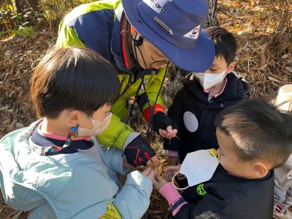봄을 맞이한 숲속에서 숲해설가와 아이들이 뾰족뾰족 솔잎 관찰을 하고 있다. 산림청 국립자연휴양림관리소는 이달부터 산림교육문화프로그램을 본격운영한다.