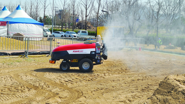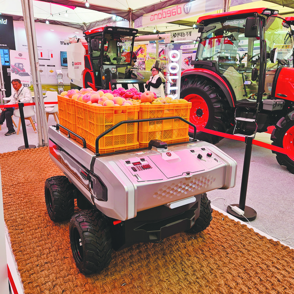 이번 상주농기계박람회에서 대동은 운반로봇 RT100을 관람객들에게 선보였다. RT100은 손가락 하나로 와이어를 가볍게 당기면서 조작할 수 있는 기술인 ‘TFS’를 적용해 전후진은 물론 360도 회전도 3.2㎡ 이내의 좁은 땅에서 가능하다. 최대적재용량 300kg에 최대 52cm까지 리프트 조절가능하고 40도까지 덤프할 수 있어 상·하차 작업이 편리하다. 대용량 전기배터리를 사용하며 대동에 따르면 연 100일간 4시간씩 사용할 시 연간 전기료가 3만4560원에 불과하다. 내연기관과 달리 오일, 필터 등 부품교체도 필요없어 유지비도 0에 가깝다.