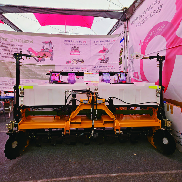 경북스타기업 불스는 트랙터 부착형 파종기를 전면에 내세웠다. 특히 3조 무피복 정밀 콩 파종기인 BG-1400CA3V2는 경운, 두둑성형, 파종까지 일관작업이 가능하며 백태, 서리태, 옥수수, 땅콩 등 다양한 종자 파종이 가능하다. 또 2절링크 구조로 수직 상하 작동해 경사지 파종도 용이하며 습한 토양에서도 파종 가능하다. 투명한 호퍼로 잔량도 확인할 수 있다.