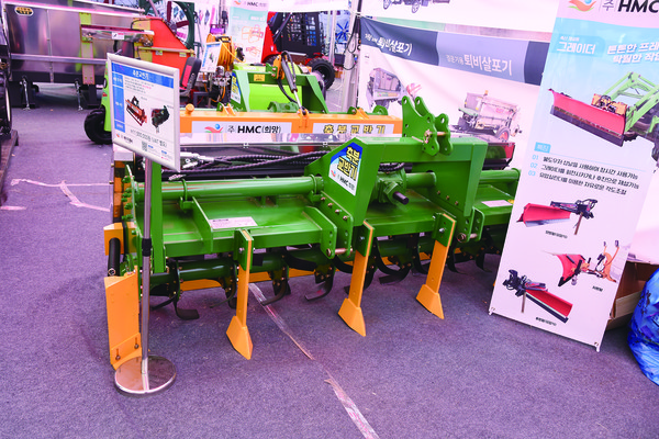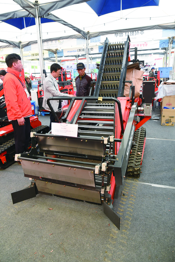 성부산업은 새롭게 개발 완료 직전인 밭작물 수확기로 농업인들의 관심을 끌었다. 농림식품기술기획평가원 과제로 개발 중인 밭작물 수확기는 내연기관이 아닌 전동식으로 움직여 토질과 작물에 따라 속도조절이 용이해 작업 효율을 높였다. 또 기존 수확기보다 크기도 줄여 1톤 트럭만으로도 적재·운반 가능해 보다 많은 농가들이 편리하게 사용할 수 있게 됐다. 마늘, 양파, 감자 등을 수확할 수 있으며 내년에 출시될 예정이다.