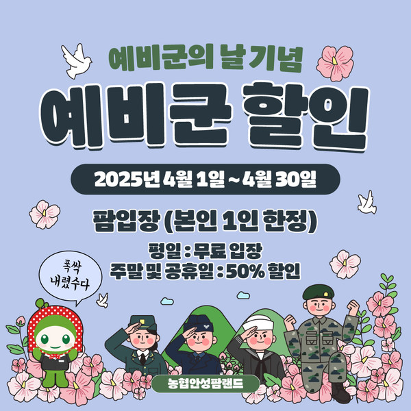 농협 안성팜랜드가 예비군의 날이 있는 이달 동안 국가를 위해 헌신한 예비군들에게 감사의 마음을 전하고자 특별 할인 이벤트를 실시한다.