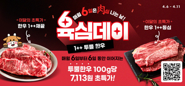 육심데이는 매월 6일부터 6일 동안 진행하는 정기행사로 이달의 초특가딜 상품은 △1++ 등심(400g×2팩) 5만6900원 △1++ 등심(400g)+채끝(400g) 6만5900원이다.