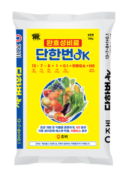 ‘단한번OK’는 완효성과 토양개량, 미량요소 효과를 한 번에 보유한 제품이다. 기능성 성분인 NS는 부식산, 아미노산이 최적의 비율로 조합돼 있어 종합적 토양개량과 작물 생육에 도움을 준다. 염류집적이 심한 시설재배지 또는 다년생 작물 재배지의 염류를 분해해 작물이 이용 가능한 양분으로 전환시킴으로써 보비력을 증가시켜 뿌리의 생육과 활력을 높이고 작물의 수분을 조절한다.