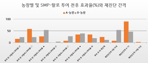 SMP-할로®여한 후 한우에서는 38마리 중 35마리가 증상들이 개선된 것으로 나타나 92.1%의 효과를 나타냈다. 젖소는 26마리 중 18마리가 개선돼 69.2%의 효과를 나타했다.