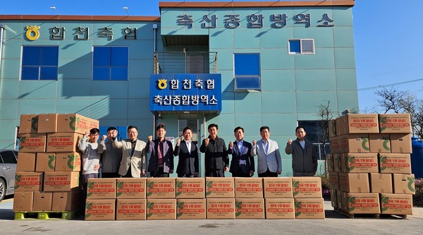 합천축협(조합장 김용욱, 사진·왼쪽부터 6번째)은 지난 7일 가축전염병 확산에 대비해 전 조합원들을 대상으로 가축 방역용품을 지원했다.