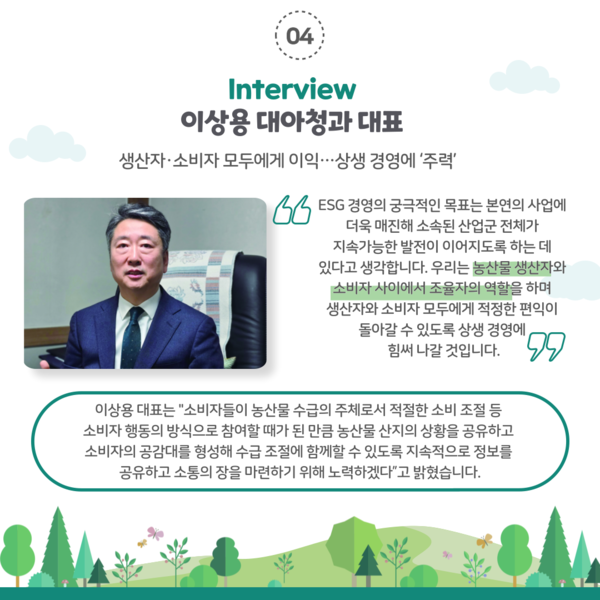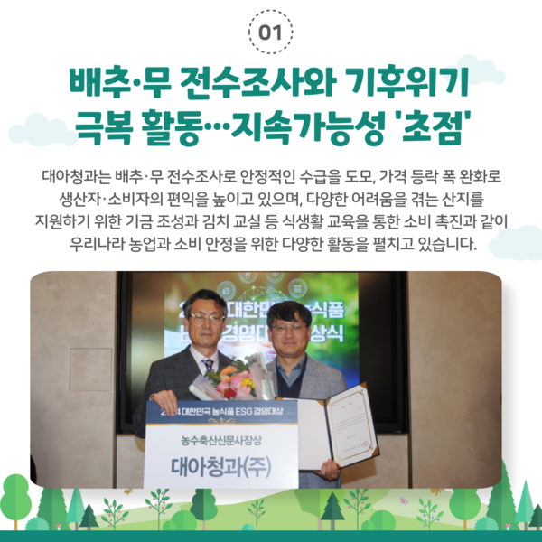 여섯섯번째 기업은 2024 대한민국 농식품 ESG경영대상에서 우수상인 농수축산신문사장상을 수상한 대아청과입니다.