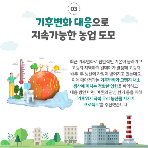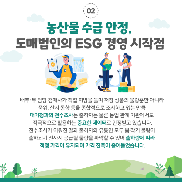 대아청과는 배추·무 전수조사로 안정적인 수급을 도모, 가격 등락 폭 완화로 생산자·소비자의 편익을 높이고 있으며, 다양한 어려움을 겪는 산지를 지원하기 위한 기금 조성과 김치 교실 등 식생활 교육을 통한 소비 촉진과 같이 우리나라 농업과 소비 안정을 위한 다양한 활동을 펼치고 있습니다.