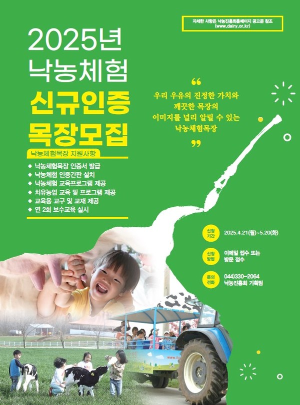 낙농진흥회(회장 김선영)가 2025 낙농체험 목장 신규 접수를 지난 21일부터 다음달 20일까지 진행한다.