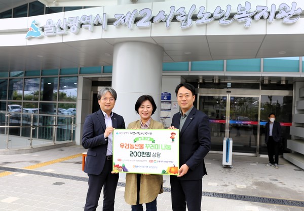 전국금융산업노조 NH농협지부 울산지역본부(위원장 임종경)는 지난 22일 농촌사랑 농산물 꾸러미(50세트, 200만 원 상당)를 울산광역시 제2시립노인복지관에 전달했다.