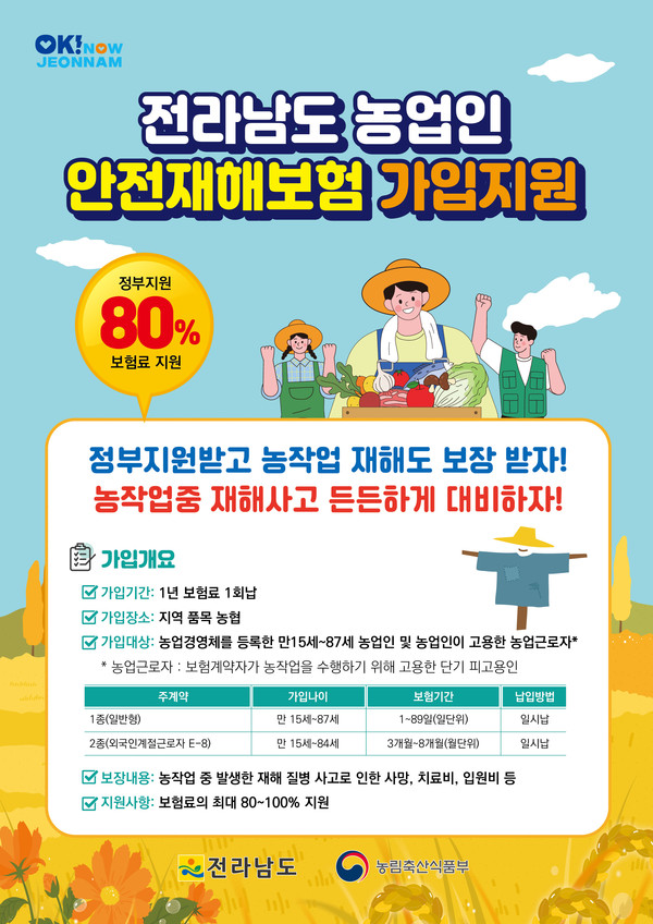 유덕규 전남도 식량원예과장은 “농업 인구의 고령화와 장시간 반복되는 노동으로 농업인이 각종 사고와 질병(농부병)에 노출돼 있다”며 “본격적인 영농철이 다가옴에 따라 예기치 못한 사고에 대비하기 위해 반드시 보험에 가입할 것”을 당부했다.