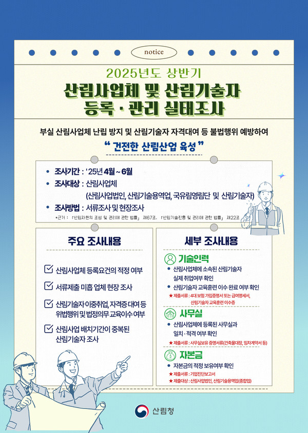 산림청이 오는 6월 말까지 건전한 산림사업체 양성과 산림기술자 제도 정착을 위해 올해 상반기 산림사업체와 산림기술자 실태조사를 실시한다.
