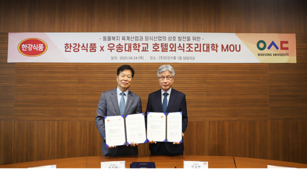 ㈜한강식품(대표 박길연)이 동물복지 육계 산업과 외식 산업의 지속적인 발전을 위해 우송대학교 호텔외식조리대학과 업무협약(MOU)을 체결했다고 지난달 25일 밝혔다.