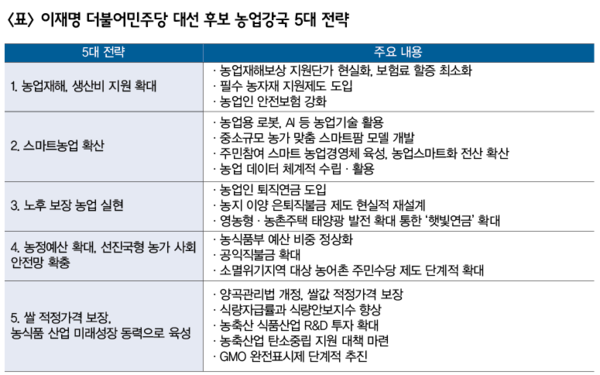 이 후보가 정책발표문을 통해 농정 대전환으로 위기를 기회로 바꾸고 K-농업강국으로 도약하기 위해 제언한다고 밝힌 다섯 가지 전략의 주요 내용은 농업재해 보상 현실화, 스마트농업 확산, 농업인 노후 보장, 농가소득 안전망 구축, 쌀 적정가격 보장과 농식품산업 육성 등이다.