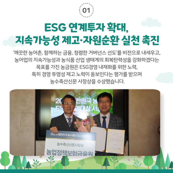 ‘깨끗한 농어촌, 함께하는 금융, 청렴한 거버넌스 선도’를 비전으로 내세우고, 농어업의 지속가능성과 농식품 산업 생태계의 회복탄력성을 강화하겠다는 목표로 달려나가고 있는 농금원은 ‘2024 대한민국 농식품 ESG 경영대상’에서는 ESG경영 내재화를 위한 노력, 특히 경영 투명성 제고 노력이 돋보인다는 평가를 받으며 농수축산신문 사장상을 수상했다.