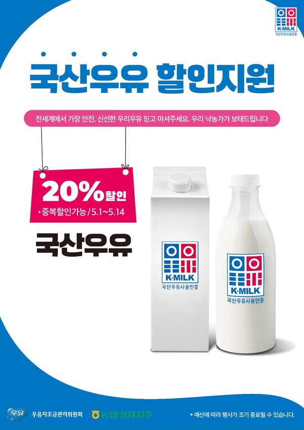 행사에서는 K-MILK가 부착된 흰 우유 제품을 대상으로 20% 이상 특별할인을 적용하며 매장별 할인까지 포함될 경우 소비자는 최대 40% 할인된 가격으로 국산 우유를 구매할 수 있다.