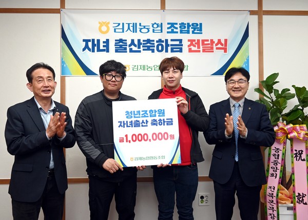 전북 김제농협(조합장 이정용)은 지난달 25일 본점 조합장실에서 자녀를 출산한 청년 조합원에게 출산축하금을 전달하고 격려했다.