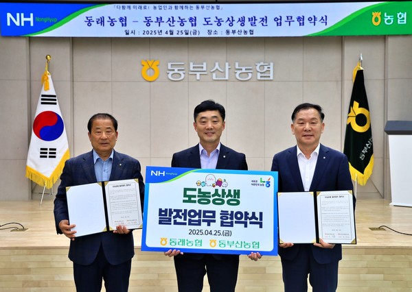 동래농협(조합장 이재송, 사진 오른쪽)과 동부산농협(조합장 송수호, 사진 왼쪽)은 지난달 25일 동부산농협 자재센터에서 ‘동래농협-동부산농협 도농상생 발전 업무협약’을 체결했다.