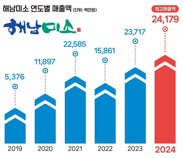 해남군이 운영하는 온라인 공익쇼핑몰 ‘해남미소’는 지난해 전국 지자체 온라인 쇼핑몰 중 1위를 차지하며 누적 매출액 241억 원을 돌파하는 성과를 달성했다. 해남의 우수한 농식품을 전국 소비자에게 직접 연결함으로써 지역 농업인들에게는 안정적인 판로와 소득을 제공하고 소비자에게는 믿고 먹을 수 있는 건강한 먹거리를 제공하는 데 기여하고 있다.