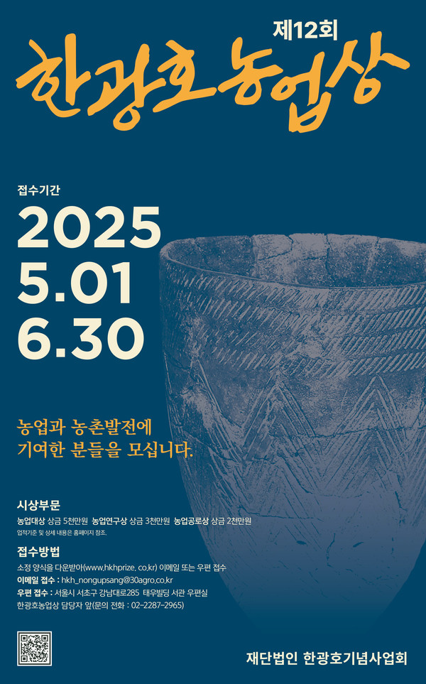 (재)한광호 기념사업회는 국내 농업과 농촌 발전에 기여한 농업인과 농업계 학자를 발굴해 시상하는 제12회 한광호 농업상 후보자를 다음달 30일까지 접수 받는다.
