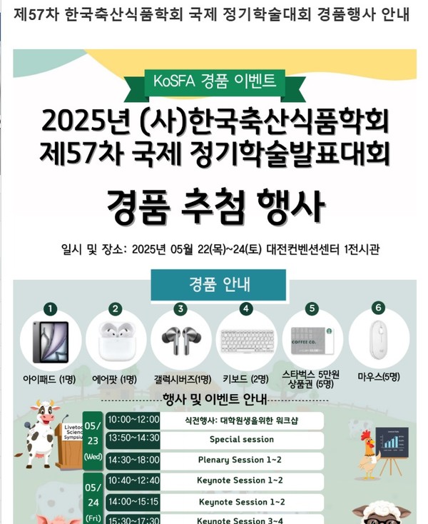 참가 대상은 축산식품 관련 연구자, 대학원생, 산업계 종사자 등으로 대학원생을 위한 구두·포스터 발표, 네트워킹 세션도 별도로 운영된다.