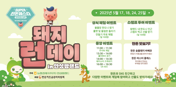 농협 안성팜랜드는 한돈자조금관리위원회와 한돈을 테마로 한 소비자 참여형 체험축제인 ‘돼지런데이 인(in) 안성팜랜드’를 이달 셋째·넷째 주 주말 안성팜랜드 전역에서 개최한다.