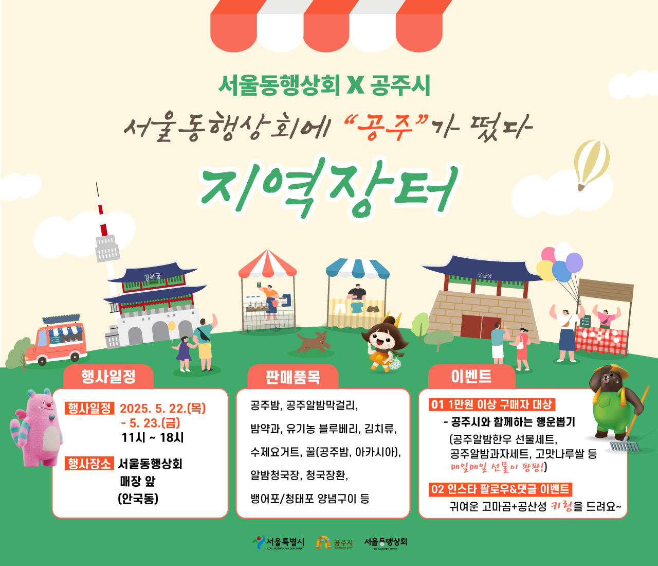 공주시(시장 최원철)가 오는 22일부터 23일까지 서울 종로구 안국동 ‘서울동행상회’ 외부 장터에서 우수 농·특산물 판촉 행사를 연다.
