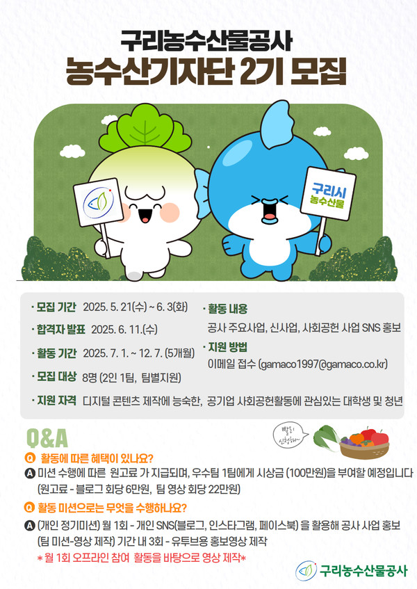 구리공사 관계자는 “농수산기자단에 선정되면 소정의 활동비가 지급되며 활동 종료 후에는 수료증을 제공하고 우수 활동 서포터즈도 선정해 시상할 예정인 만큼 많은 지원 바란다”고 밝혔다.