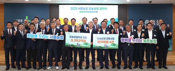 서울농협은 지난 26일 농협중앙회 중앙본부 본관 2층 중회의실에서 ‘서울농협 도농상생 협약식’을 개최하고 3353억 원의 무이자 도농상생자금 지원 계획을 밝혔다.