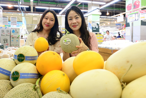 농협유통은 무더운 여름철을 이겨낼 제철 대표 과일로 멜론을 추천했다. 농촌진흥청에 따르면 멜론의 녹색과 황록색 과육은 비타민C가, 적색 과육에는 카로틴과 비타민A가 풍부하며 이뇨작용이 있는 칼륨과 콜레스테롤 수치를 낮추는 식유섬유인 팩틴이 풍부하게 함유돼 있다. 사진은 지난 17일 하나로마트 양재점에서 멜론을 선보이고 있는 모델들의 모습.