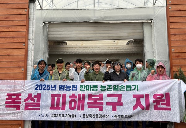 이날 음성축산물공판장 직원 60여 명은 지난 겨울 폭설로 붕괴된 비닐하우스 복구작업, 자재 정리, 집기 운반, 환경정화 활동 등 농가 피해 복구 활동에 구슬땀을 흘렸다.