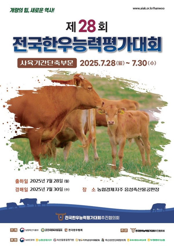 한편 ‘제28회 전국한우능력평가대회’는 사육기간단축부문과 미경산우부문, 본대회로 나눠 진행되며 미경산우부문은 오는 9월 1~3일까지 부경축산물공판장에서, 본대회는 오는 11월 3~5일까지 농협음성축산물공판장에서 개최된다. 아울러 수상농가들에 대한 시상식은 오는 12월 중 축산물품질평가원 세종홀에서 합동으로 개최될 예정이다.
